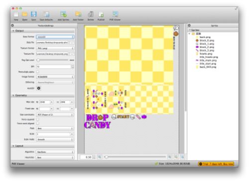 TexturePacker は、複数の画像を1つの画像にまとめるツール。cocos2d で「スプライトシート」を使うために、ダウンロードして試してみた。 DROP CANDY - ハロウィンパズル の画像で試してみた。画像が入ったフォルダをドラッグ&ドロップするだけで、1枚の…