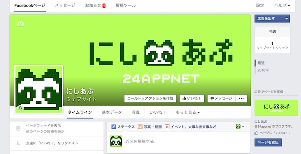 2016-02-14 Facebookページはじめました 『にしあぷ』のFacebookページを作りました。このブログが更新されると、Facebookページに投稿されます。普段Facebookをお使いの方は、「いいね!」してみてください(๑´ڡ`๑) 2016/07/13追記:いいね!されるほど、更新もPVもなかったのでページ消しました(´・ω・`)